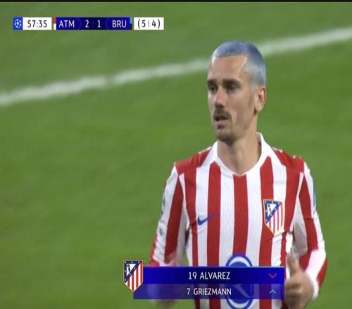 北京時(shí)間2月25日,在歐冠淘汰賽附加賽次回合馬德里競(jìng)技主場(chǎng)與布魯日的比賽中,格列茲曼第58分鐘替補(bǔ)胡利安-阿爾瓦雷斯出場(chǎng)。