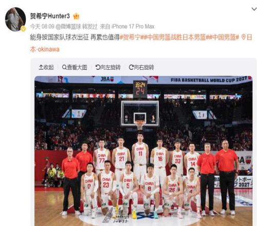 北京時間2月27日晨,中國男籃后衛(wèi)賀希寧在社媒上發(fā)聲:能身披國家隊球衣出征,再累也值得。(賀希寧這樣的言論讓無數(shù)的中國球迷為之動容)